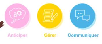 List of 3 buttons : anticiper (anticipate), gérer (manage), communiquer (communicate), based on images.