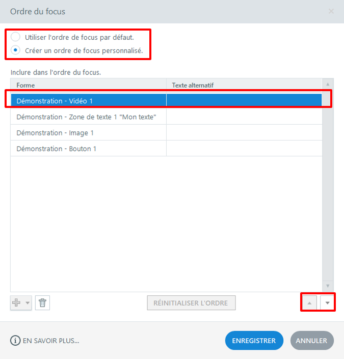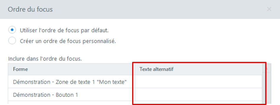 Alternative texts can be defined from the "Focus order" panel.