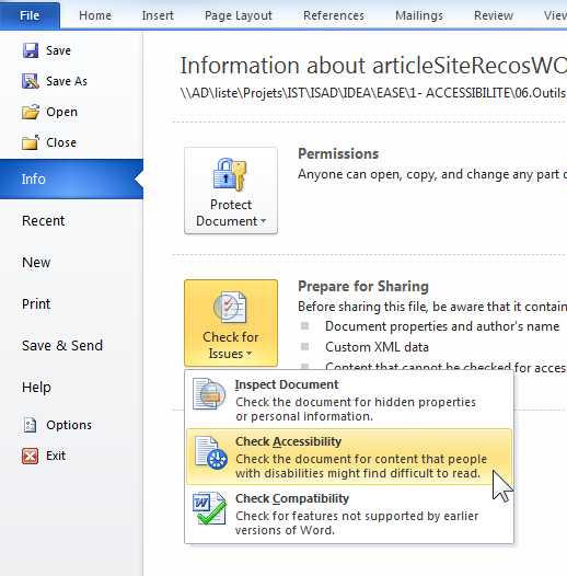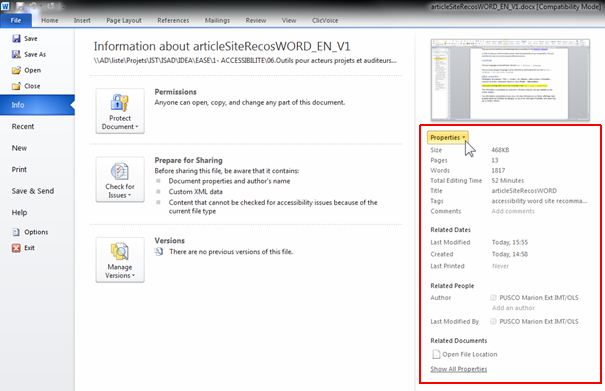 Note: with Word 2010, generated PDF documents may have accessibility issues (especially with the images vocalization). These issues have been fixed in later versions of Microsoft Office.