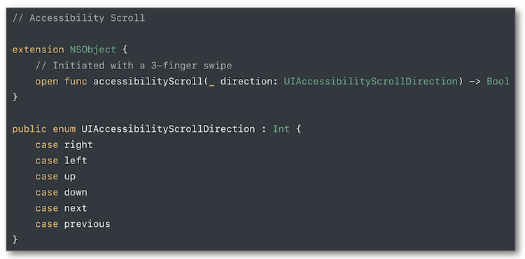 The VoiceOver basic scrolling is based on a 3 fingers swipe but it can be customized thanks to the accessibilityScroll method belonging to the UIAccessibilityAction protocol.