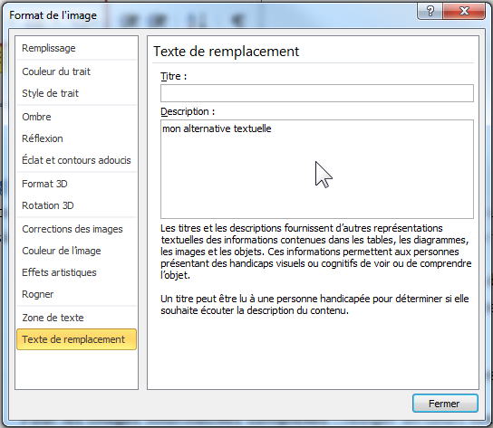 - Pour les images porteuses d’informations : renseigner un texte de remplacement qui reprend le contenu informatif de l’image : clic droit > Format de l’image > Texte de remplacement > champ « Description ».