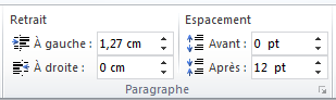 - Menu Mise en page > Paragraphe > Retrait ou Espacement ou Clic droit : « Paragraphe… »
