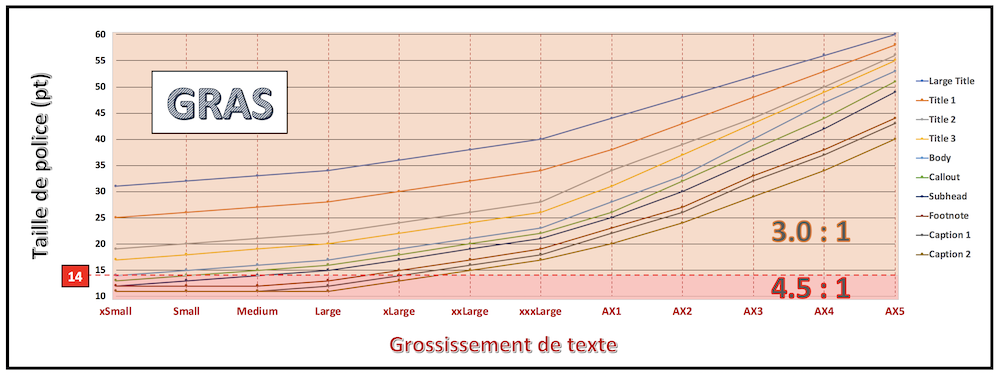 Avec l’apparition du Dynamic Type permettant de modifier de façon conséquente la taille de police, le contraste des couleurs n’est pas nécessairement figé et doit s’adapter au grossissement souhaité.
