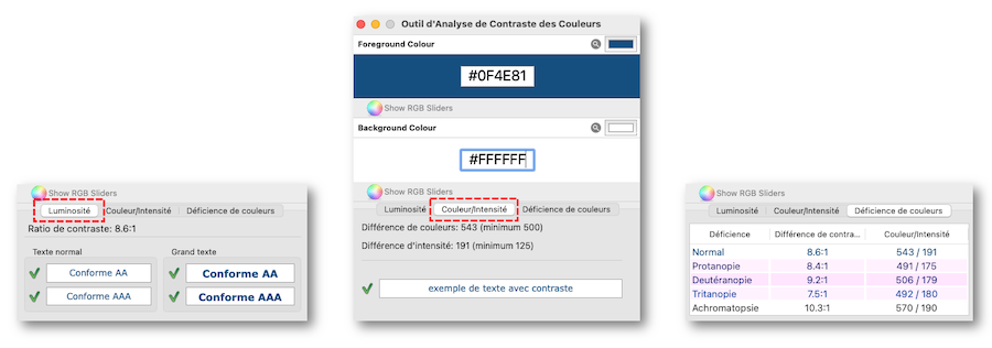 l’application Colour Contrast Analyzer (version 2.3) permet de mesurer rapidement des niveaux de contraste de couleurs (gratuit pour mac et windows),