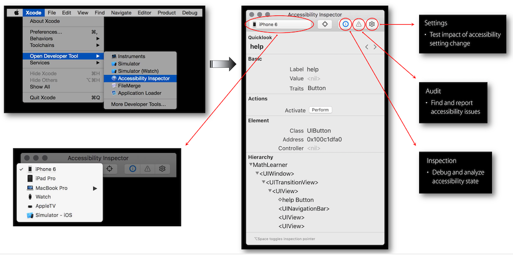 Cette présentation visualisable sur le site développeur officiel d'Apple (session 407) a pour but d'expliquer l'outil de développement Accessibility Inspector et comment l'utiliser par le biais d'une application d'exemple très simple.