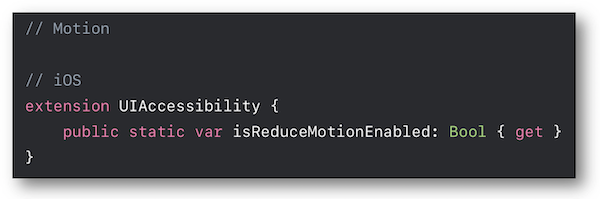 Côté développement, le suivi de la modification de ce réglage se fait grâce à la valeur de isReduceMotionEnabled et permet d'adapter les effets de l'application aux souhaits de l'utilisateur s'ils ne sont pas automatiquement pris en compte.