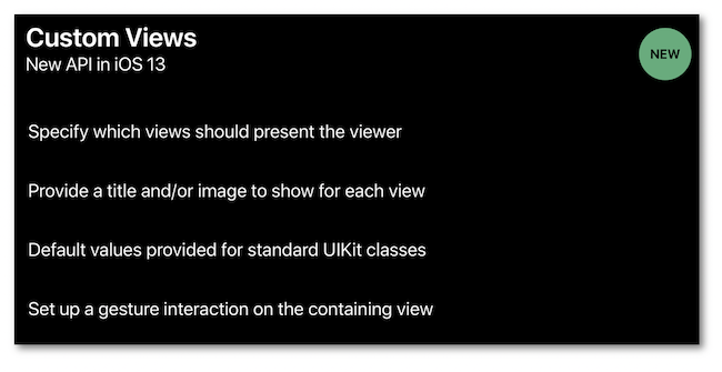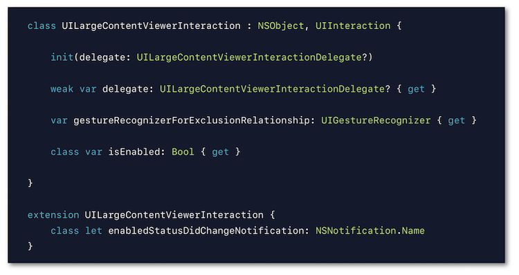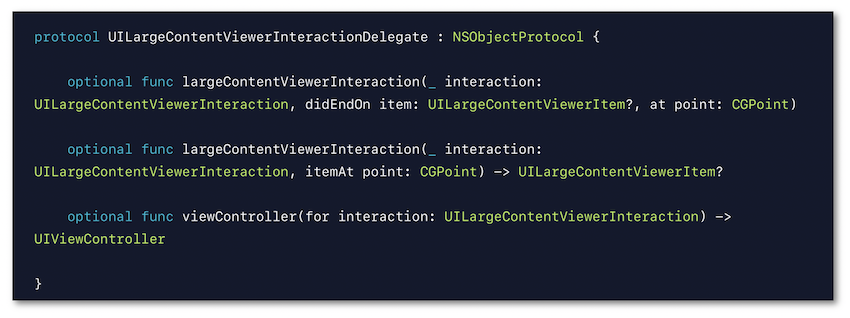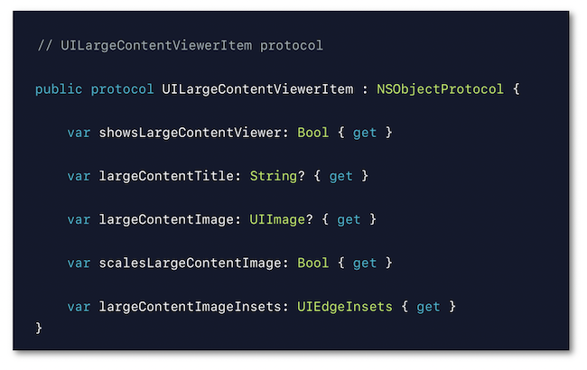 Le protocole UILargeContentViewerItem (05:35) définit toutes les informations nécessaires au Large Content Viewer ⟹ la classe UIView se conforme à ce protocole par défaut :