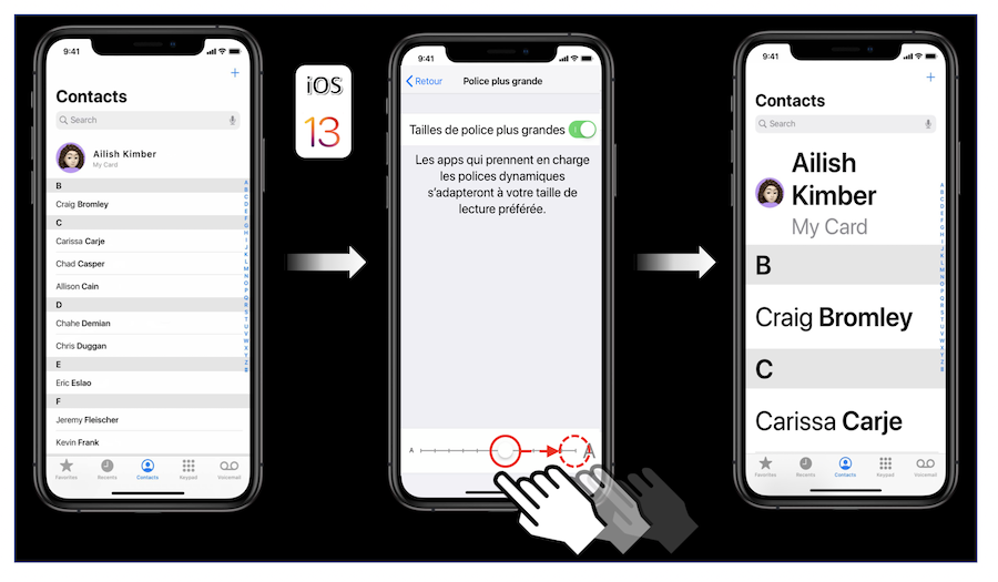 Cette présentation visualisable sur le site développeur officiel d'Apple (session 261) détaille les nouveautés iOS 13 de la fonctionnalité Large Content Viewer utilisée par les personnes souhaitant visualiser l'écran avec une taille de police personnalisée et implémentée de concert avec le Dynamic Type depuis iOS 11.